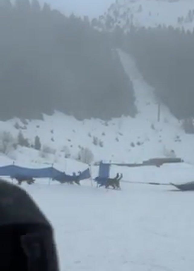 dog sled team and musher in a snowy mountain environment. The team, consisting of several dogs, is pulling a sled across a snow-covered field. A person, presumably the musher, stands near the sled, guiding the dogs. In the background, a mountain slope is visible, partly obscured by fog or mist. The sky appears overcast, contributing to the overall dim lighting of the scene. There are blue barriers set up in the snow.