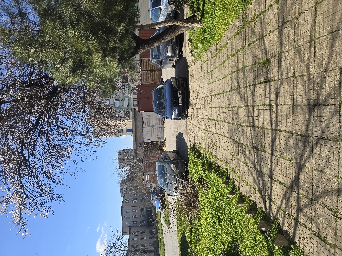The image displays an outdoor, daytime scene within a residential area of Yambol, Bulgaria, under a clear blue sky. A paved pathway, composed of rectangular concrete pavers with grass growing in the interstices, extends from the foreground towards the midground, marked by distinct shadows of overhead tree branches. To the left of the pathway, a patch of green grass is bordered by a series of small, grey, triangular concrete bollards. A dense green tree trunk and foliage occupy the right foreground, bordering the pathway. In the midground, a dark blue or black BMW sedan is parked facing the viewer at the end of the paved pathway, displaying a Bulgarian license plate (partially visible as "PB C"). To its immediate left, a dark-colored sedan is partially obscured by overgrown vegetation. To the BMW's right, a dark grey or black SUV is parked, partially hidden by the right foreground tree. Beyond these vehicles, a row of garages or storage units with varying facades, including light-colored doors and dark reddish-brown panels, is visible. The background features several multi-story residential apartment buildings of concrete construction, characteristic of Eastern European architecture. Various trees are present; some are mature and bear light-colored blossoms, while others are deciduous or evergreen. No individuals are visible within the scene, and no active interactions are depicted.