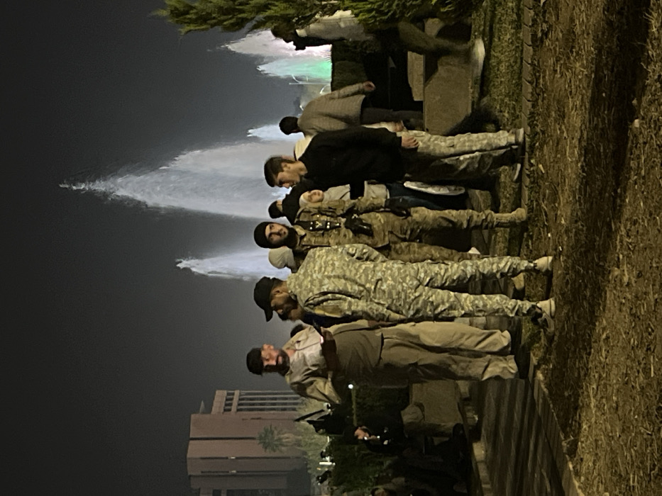 At night, a line of people, several in military attire, stand before illuminated fountains. The fountains spray water high into the air. The people are diverse in dress and appearance. A building is visible in the lower-left corner, and greenery borders the right side of the scene. The light source appears to be from the buildings and grounds around the fountain.