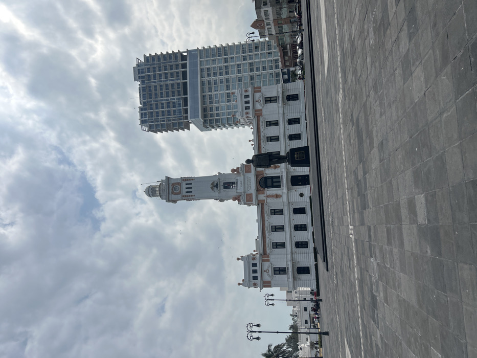 A low-angle shot shows a historic white building with a tall clock tower and a statue in front, set against a cloudy sky. A modern high-rise building is seen behind the historic building. The foreground consists of a paved square. The perspective is angled, emphasizing the height of the structures. Street lamps line the front of the building.