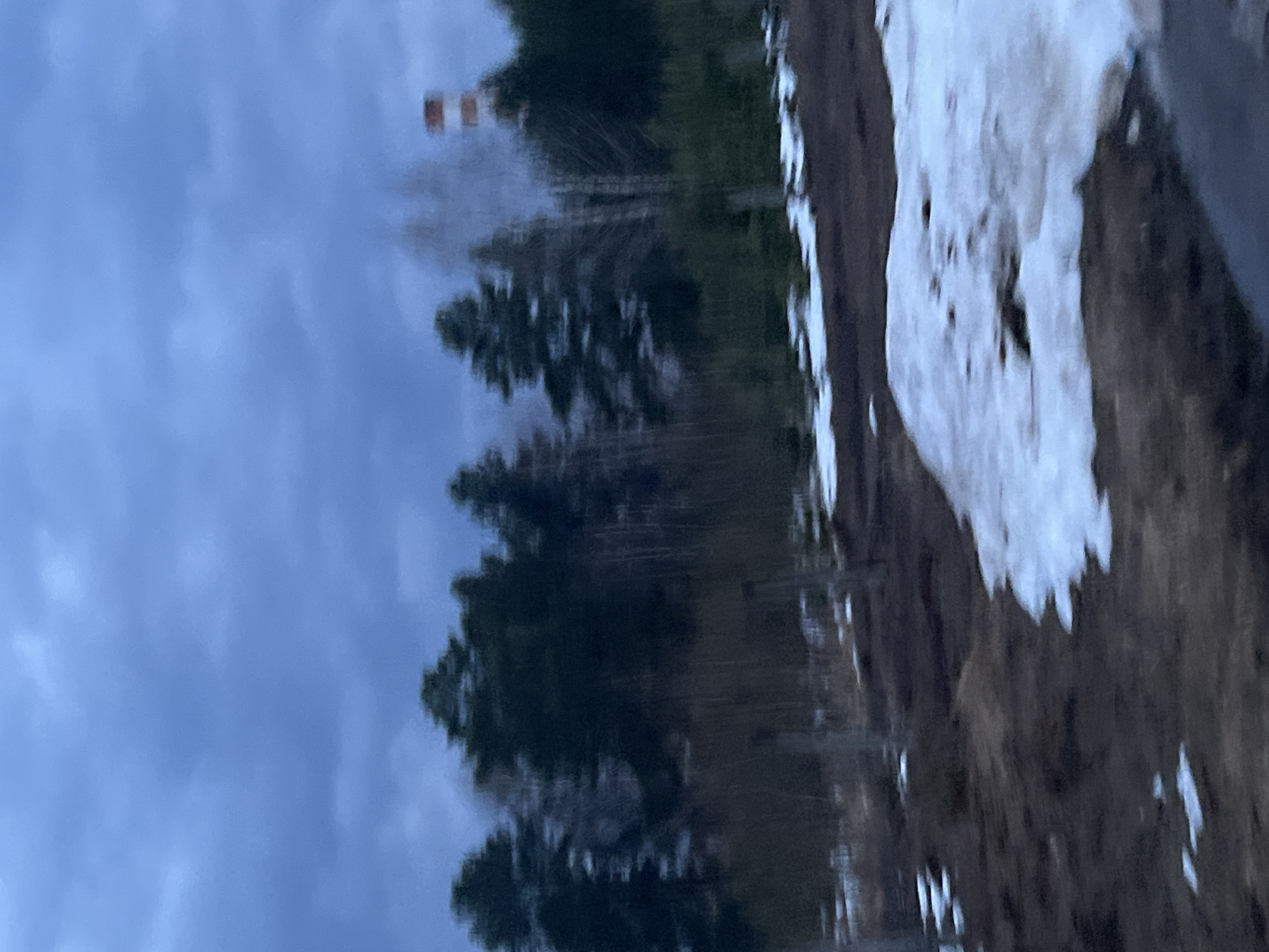 landscape in Марковский, Russia. In the foreground, there's a patch of melting snow on dark earth. Behind that, a line of trees is visible, with dark green coniferous trees mixed with bare, light-colored deciduous trees. In the distance, a tall structure with red and white markings can be seen, partially obscured by the trees. The sky is overcast with dark blue-gray clouds.