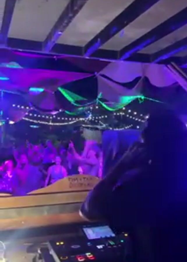 DJ performing at a crowded outdoor party. The DJ is behind a mixing console, wearing headphones, and adjusting controls. The crowd is dancing with their arms raised. Colorful stage lights and string lights illuminate the scene. Above the crowd, fabric sails hang from a wood beam structure. A handwritten sign on the DJ's equipment says "Tim & Tom Decorate."