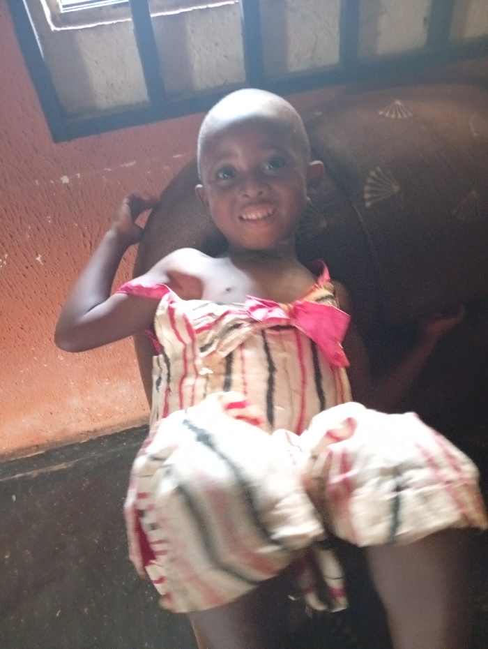 A young, bald-headed child smiles broadly while seated. They wear a light-colored, striped top or dress, accented with pink. The child is partially reclined against a large, patterned cushion or chair. A window with a dark frame is visible in the upper left corner. The background includes a textured, reddish-brown wall, creating a warm, indoor setting.