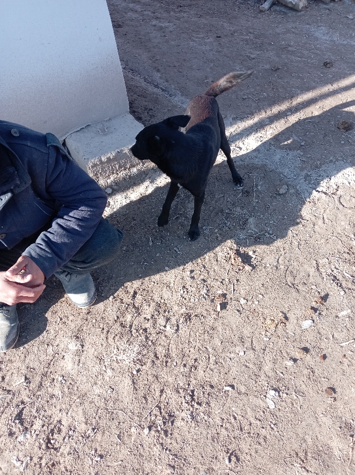 An outdoor scene in Chimbay, Uzbekistan, depicts a partially visible individual crouching on a dry, dusty ground surface. The individual, wearing a dark blue long-sleeved garment and dark trousers, is positioned in the lower-left quadrant of the frame, with light grey shoes visible. Their hands are clasped in front. To the right of the individual stands a medium-sized dog with predominantly black fur, featuring a distinct reddish-brown patch on its back and a light brown, bushy tail. The dog is oriented to the viewer's left, looking away from the camera. Behind the crouching individual and to the dog's left is a light-colored concrete block or foundation. Strong, elongated shadows are cast across the ground, indicating direct sunlight from an elevated source. The ground consists of light brown soil with scattered small rocks and debris.