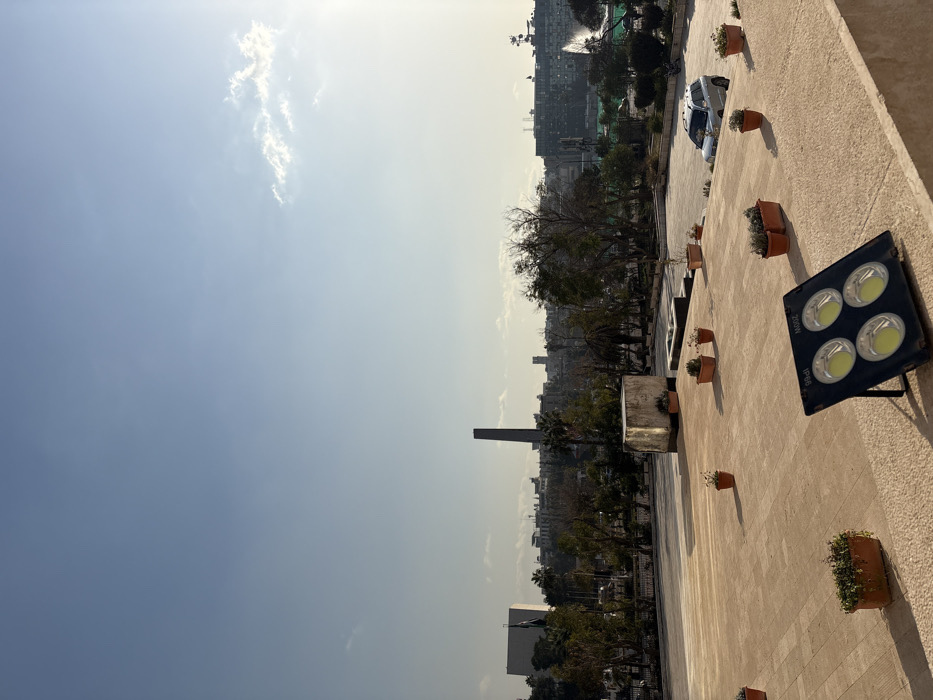 An outdoor daytime photograph shows an elevated view of Al-Muhajerin Municipality, Syria, under a clear blue sky with minimal scattered clouds. The foreground features a light-colored paved terrace with numerous terracotta plant pots, some containing small plants or shrubs. In the lower right, a black rectangular LED floodlight with four circular light elements is positioned on a raised edge, displaying "IP66" and "200W" text. The midground consists of a landscaped area with a mix of deciduous trees, many with bare branches, and evergreen palm trees. Behind this foliage, a light-colored SUV is partially visible on a road to the right. The background reveals a dense urban cityscape with various buildings. A prominent, tall, dark, obelisk-like structure stands in the left-center background. Further right, a large building complex with intricate rooflines is visible. A green body of water with an active fountain spraying upwards is discernible behind the midground trees. Distant hills are faintly visible on the horizon line. No individuals are present in the scene.