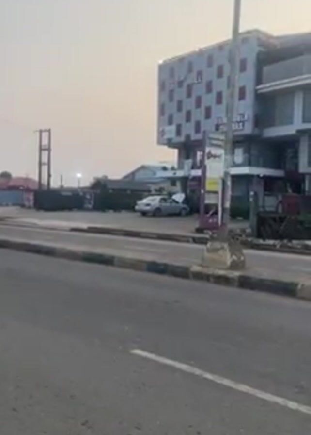 A street scene in front of a three-story building labeled "Filmworld Cinemas" is shown. The building is gray and red with a grid pattern on the top half. A car with its hood open is parked in front of the building. The street is empty and gray. There are utility poles on the left side of the frame and some vegetation near the building. The sky is pale and overcast.