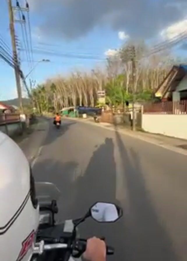 first-person perspective of someone riding a white motorcycle down a paved road in a tropical area. The rider is wearing a white helmet. Two other motorcyclists are ahead on the road. There are utility poles with wires on the left side of the road. The right side of the road has buildings and trees. The sky is blue with some clouds.
