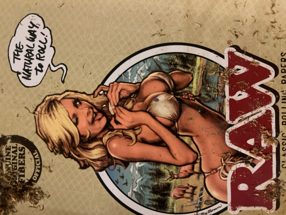 The image displays a close-up, overhead view of a light tan or beige surface, likely packaging material, heavily soiled with scattered dry, brownish-green plant fragments. A prominent circular illustration features a blonde, fair-skinned woman with her tongue slightly extended and one eye winking. She wears a white string bikini and is depicted holding and apparently rolling a small, cylindrical object. The background within the illustration portrays a stylized natural landscape with blue sky, white-capped mountains, green forests, a body of water, and two brown deer. A speech bubble above the woman's head contains the text "THE NATURAL WAY TO ROLL!". In the lower section of the packaging, partially obscured by debris, the large red word "RAW" is visible, along with smaller text "CLASSIC ROLLING PAPERS". An upper-left circular emblem states "GENUINE ORIGINAL FIBERS OFFICIAL". The specific location in Palma, Spain, is undetermined from the visual information provided.