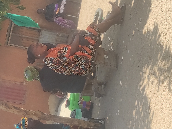 The image depicts an outdoor scene in Langtang, Nigeria, featuring four women and a residential building