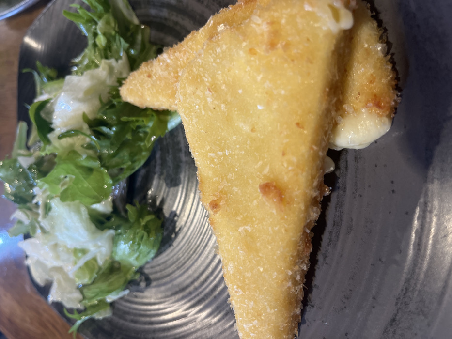 A close-up, slightly overhead forensic view depicts a prepared meal served on a dark, textured plate. The primary subject is two triangular pieces of deep-fried cheese, exhibiting a golden-brown, finely-breaded exterior. Melted white cheese is visibly oozing from between the two pieces and along the bottom edge where they contact the plate. Positioned behind the fried cheese, partially out of focus, is a small portion of fresh green leaf lettuce, possibly dressed. The plate is circular, dark grey or black ceramic, and features concentric ridges across its surface. The background is blurred, suggesting an indoor dining environment, with indistinct warm, light brown tones indicative of wooden surfaces or decor. No individuals are present. The specific location within Sofia, Bulgaria, cannot be determined from the visual information provided.