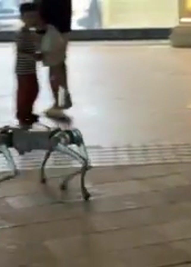 A four-legged robotic dog moves along a brick-paved path. People, including a child, walk around it. The robotic dog has a rectangular body and four legs with metal feet. It has two green lights that resemble eyes. The surroundings consist of buildings with glass storefronts and other pedestrians. The scene appears to be outdoors, on a public walkway or plaza.