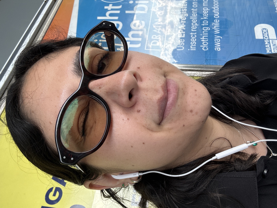A person is wearing glasses and has one eye open. They have white earphones in their ear and a necklace. The background is blurry, but appears to be a sign about drainage and using EPA-registered insect repellent on clothing. The sign is from Miami-Dade County.