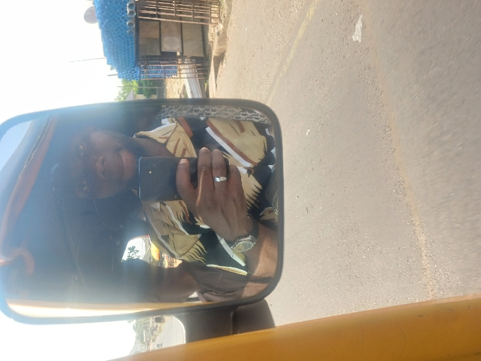 A dark-skinned male is captured in a selfie reflected in the side mirror of a yellow vehicle, likely an auto-rickshaw, on a paved street in Adankolo, Nigeria
