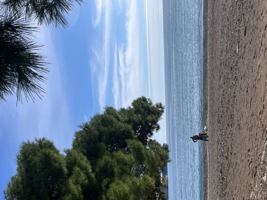 The image presents a coastal scene in Rafailovići, Montenegro, under a clear blue sky with scattered white cirrus clouds and a faint horizontal contrail in the upper atmosphere. Dense evergreen foliage, characterized by long, dark green needles, occupies the upper left quadrant and partially extends into the upper right. The mid-ground features a calm, blue-green sea, extending to a distant horizon where faint landmasses are visible on the left. In the lower mid-ground, a dark pebble and sand beach extends across the frame. A single individual, seen from behind, stands at the water's edge on the pebble line, facing the sea. The person is dressed in dark clothing, including a long-sleeved top and trousers, with hands placed on their hips. To the immediate right of the individual, two fishing rods are positioned upright in the beach, angled towards the water. Adjacent to the person and the fishing rods, a light-colored rectangular object, possibly a cooler or tackle box, rests on the pebbles.