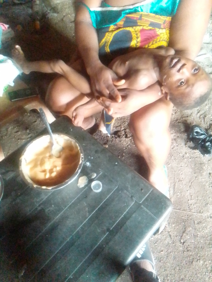 An adult individual, wearing a teal and patterned garment, is seated on a dirt ground in Owerri, Nigeria. The individual holds a light-skinned, shirtless child, who appears to be an infant or toddler, in their lap. The child displays visible rib protrusion and has residue on its face, looking directly towards the camera. In the foreground, a dark rectangular plastic table or stool supports a metallic bowl containing a light brown, semi-liquid food substance with a silver spoon immersed. Adjacent to the bowl are small light-colored spills and a white plastic cap. A mobile phone with a light-colored case is partially visible on the ground to the left of the table, and a black plastic bag rests on the ground to the right. The environment is characterized by a ground of packed dirt or sand.
