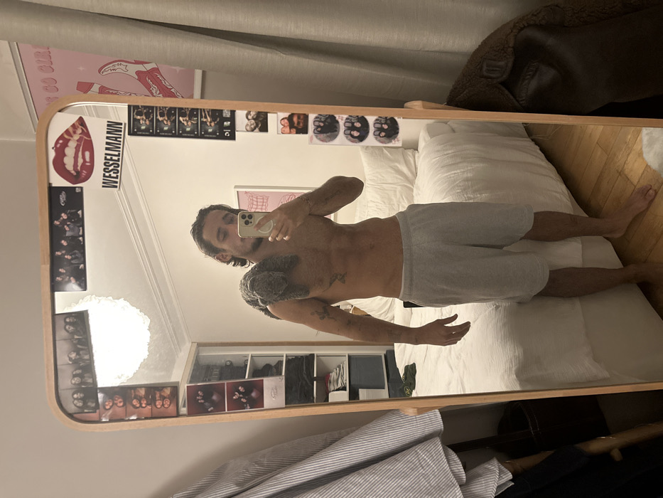A shirtless man in gray shorts is standing in front of a full-length mirror, holding a phone up to take a selfie
