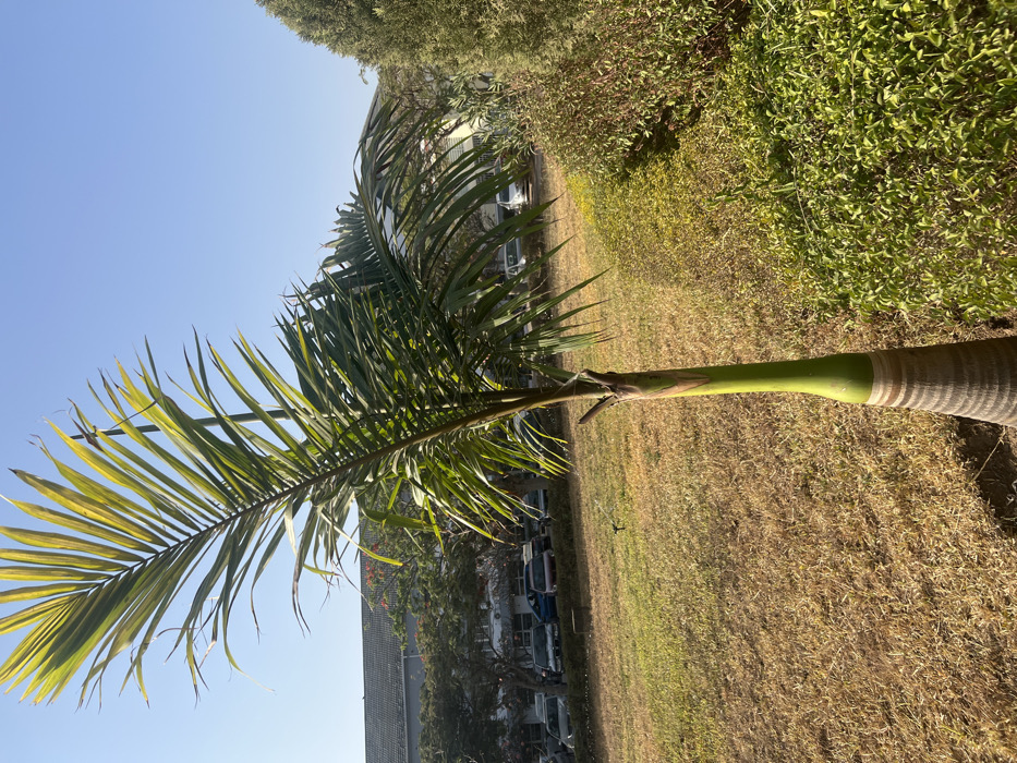 A palm tree stands in a field of dry grass. The trunk is green towards the top and transitions to a ringed, tan texture near the base. A single palm frond extends to the left against a clear blue sky. Beyond the field, a building is visible with cars parked nearby. The background includes dense green foliage at the edge of the field. The scene is illuminated by bright sunlight.