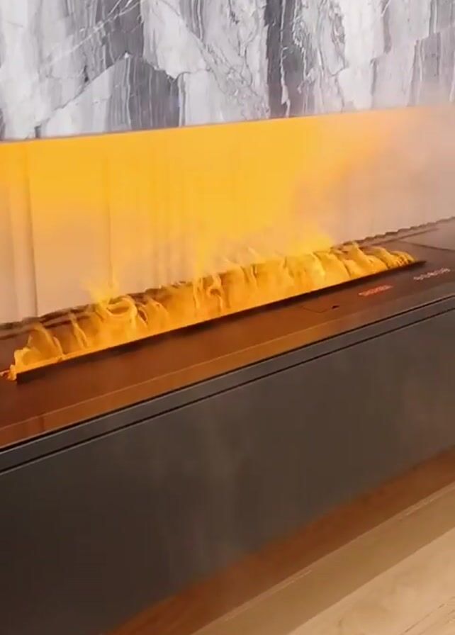 two fireplaces, one on top of the other. The bottom fireplace is a long, thin burner with flames. The upper fireplace is a television that displays a burning wood pile. The television is framed with gray marble. The lower fireplace is framed in dark gray metal, and the base is finished with wood trim. The video camera tilts up to show the upper fireplace. The video has music playing in the background.