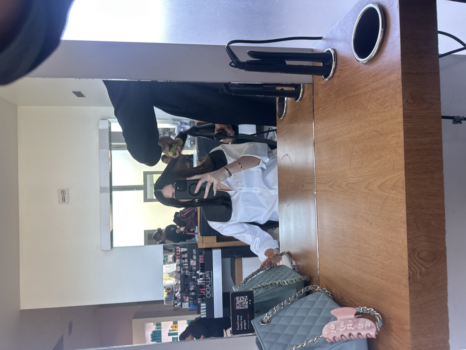 A woman is reflected in a salon mirror, taking a selfie with her phone. A hairstylist is working on her hair. On the counter, next to the mirror, is a blue quilted purse with a price tag and a pink hair clip on top. Behind the woman, shelves filled with beauty products can be seen, and another person is visible in the background.