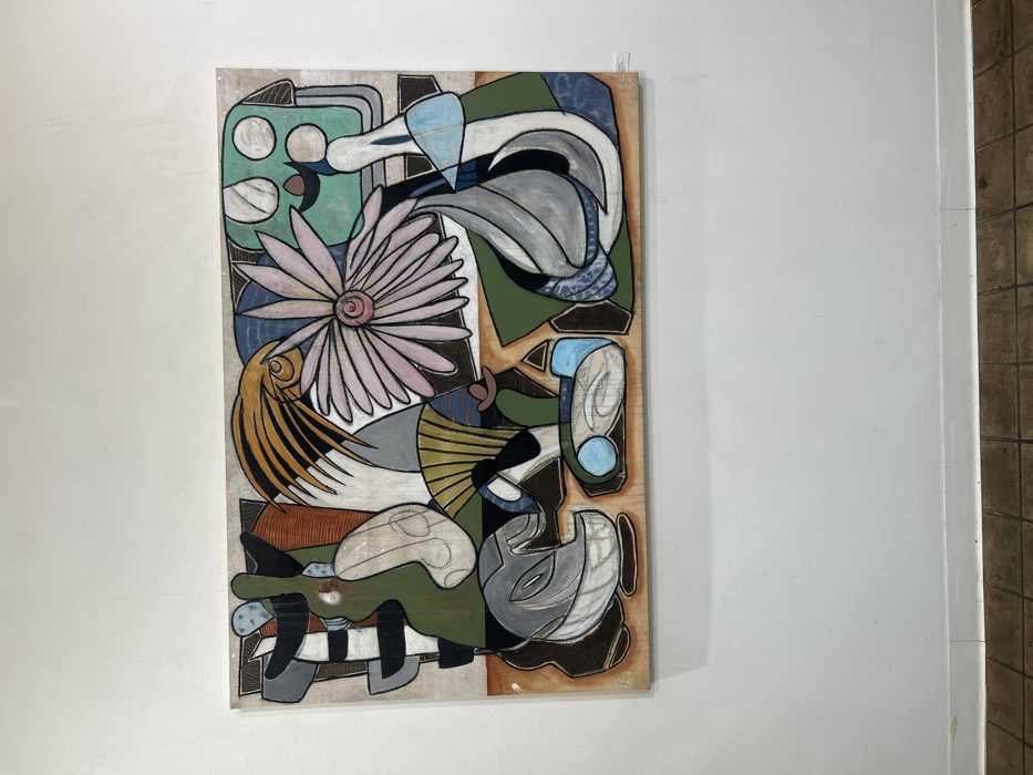 An abstract painting hangs on a white wall. It showcases a collage of shapes and forms, combining geometric and organic elements. A large daisy-like flower with pink petals dominates the upper-left. Adjacent to it are gray curved shapes, green areas, and segments with black lines. The painting's palette includes hues of gray, blue, brown, green, and a touch of orange. The composition is framed, revealing the wooden board that served as the canvas.