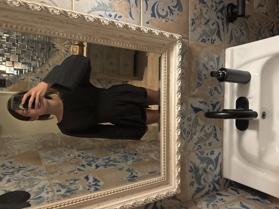 An individual is depicted taking a mirror selfie in a well-appointed restroom. The person, appearing female, wears a dark-colored, long-sleeved romper with a cinched waist and wide sleeves, obscuring her face with a silver-colored smartphone held in her right hand. She is reflected in a large, rectangular mirror featuring an ornate, off-white frame. The restroom walls are covered with aged-looking ceramic tiles displaying faded blue and muted green floral and botanical patterns on a beige background. In the foreground, below the mirror, is a white ceramic sink with a modern, matte black gooseneck faucet. A matching matte black cylindrical pump bottle rests on the sink's surface to the right of the faucet. A matte black wall-mounted towel bar is also visible to the right. The reflection in the mirror reveals a background behind the individual, including a light-colored wooden chest of drawers or vanity. Above this furniture, a textured wall art piece composed of numerous small, reflective, square elements is installed. Small, indistinct objects are visible on the surface of the chest of drawers. The precise location within the city of Miami Beach, United States, cannot be determined from the visual information provided. The environment suggests a stylish commercial establishment or a private residence.