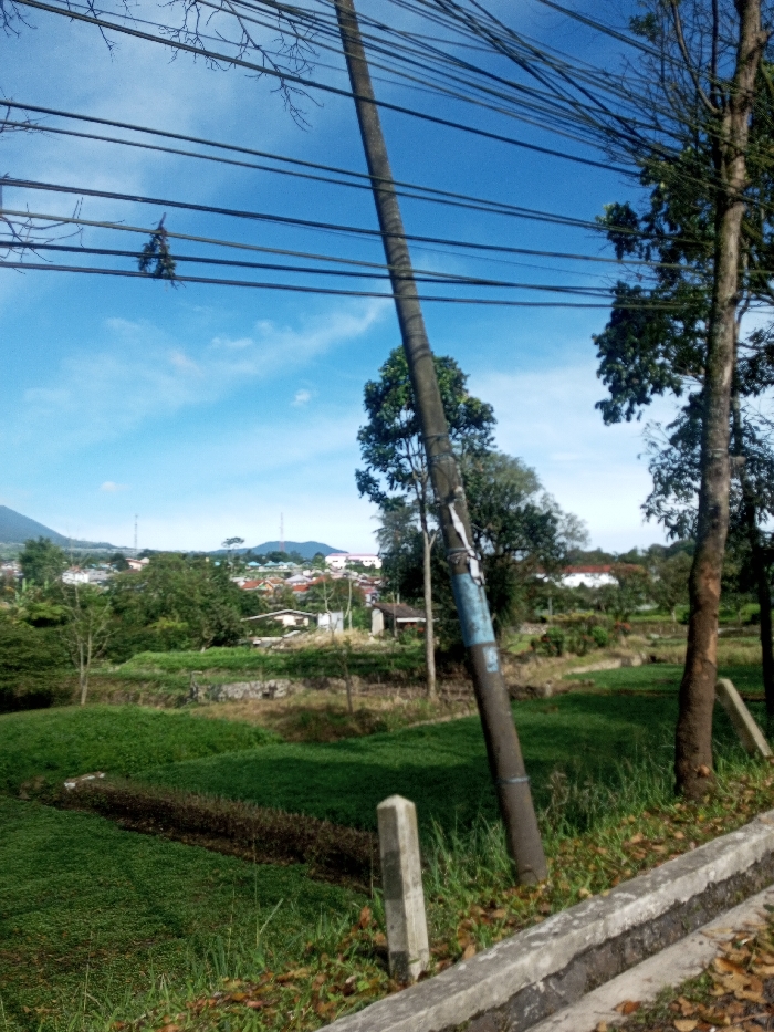 The image depicts an outdoor scene in Phonengam, Laos, under a clear blue sky with scattered white clouds. In the immediate foreground, a concrete curb or low barrier runs horizontally along the bottom right. Adjacent to it on the left, a light-colored rectangular concrete marker post is partially visible amidst green grass and scattered dry leaves. Dominating the central foreground is a dark utility pole, slightly leaning to the right, with a blue and white label or wrapping affixed to its upper section. Numerous black utility wires extend horizontally across the upper half of the frame, some intertwined with bare tree branches, and a small cluster of green foliage is visibly snagged on one of the lower wires. To the right of the utility pole, two trees with dark bark are present. The middle ground consists of expansive green fields, possibly cultivated, with a darker, narrow strip of vegetation running through them. Beyond the fields, a semi-urban settlement with numerous houses and buildings is visible, interspersed with trees. In the background, a large, green mountain range rises on the left, while several communication towers are discernible on distant elevated terrain within the settlement. No individuals or animals are present in the scene.