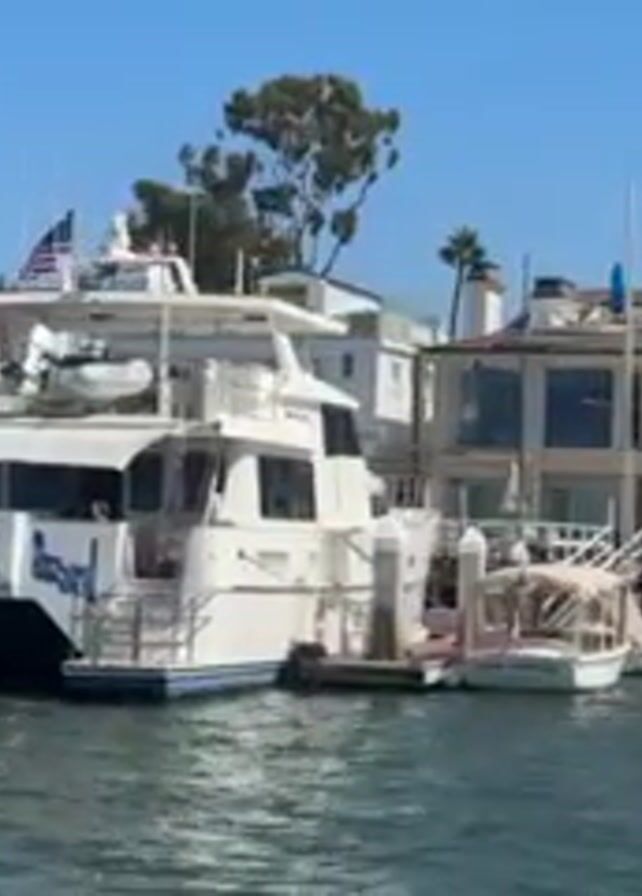 waterfront scene with several yachts and boats docked along a canal. The boats are of varying sizes and designs, ranging from small dinghies to a larger catamaran-style yacht with the name "Royal Hazard" displayed on the stern. American flags are visible on a couple of the boats. Behind the boats are waterfront houses, appearing to be upscale residences. The weather is sunny and the water is calm. The camera appears to be moving slowly, providing a view of the scene from the water.