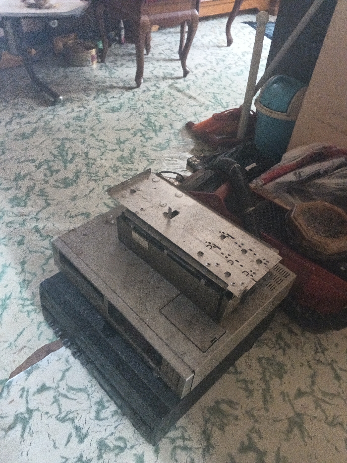 The image displays an indoor area within a building in the city of Dogsenang Gorphoog, Bhutan. The floor is covered with a light-colored surface adorned with a repeating pattern of small, teal, leaf-like designs. In the foreground, a stack of three items is visible: a dark-colored rectangular electronic device at the bottom, topped by a lighter-colored, possibly silver, rectangular electronic device featuring an access panel on its front-right. Resting on the latter is a detached silver-colored metal plate with multiple small circular perforations and slots, centered by a raised metallic fixture. To the right of these stacked electronics, a collection of objects is aggregated, including a light blue plastic bucket or bin, a light-colored pole, items of red fabric or plastic, and a brown woven object. In the background, partially visible, are two pieces of wooden furniture with slender, turned legs; one appears dark-colored on the left, and another lighter-colored piece is positioned to the right. No individuals are present in the scene, and no specific actions are depicted.
