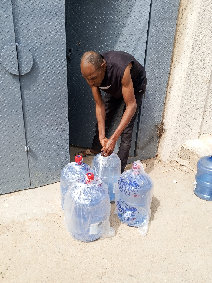 An adult male with a bald head, dark complexion, wearing a black sleeveless shirt, dark trousers, and brown sandals, is depicted outdoors in Hotoro South, Nigeria. He is bent over, attending to multiple large blue plastic water gallons on a light-colored concrete or paved surface. Four gallons are prominent in the foreground; three are in clear plastic bags with visible red caps, and one, also bagged, displays "ICEBERG WATER" branding. A fifth, unbagged blue gallon is partially visible to the far right. The background features a closed grey double-leaf metal door with a diamond plate pattern on the left, and a light-colored wall or pillar on the right.