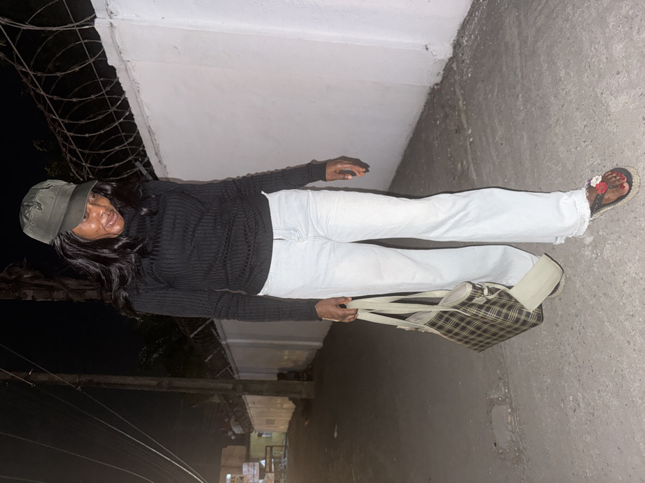 A woman stands on a concrete surface next to a white wall under dim lighting. She wears a dark green cap, a black long-sleeved shirt, and white jeans. She is holding a plaid tote bag. Her sandals have floral embellishments. Barbed wire is visible above the wall, while buildings are visible in the distance.