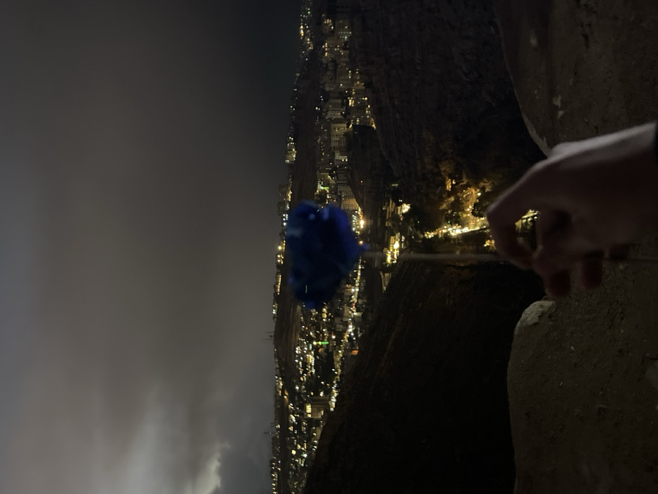 An elevated, nighttime view captures a section of Dummar Municipality, Syria, under a cloudy sky. In the foreground, a human hand is visible on the lower right, holding a slender stick-like object topped with a spherical, fuzzy blue item, possibly a piece of cotton candy or a decorative puff. The immediate ground appears uneven and unpaved. A deep, dark valley with a winding road illuminated by vehicle headlights separates the foreground from a densely built-up urban area. The city, situated on hills, is characterized by numerous illuminated buildings, with a prominent green light visible among them. The distant landscape consists of dark, undulating terrain under a heavy, obscured sky.
