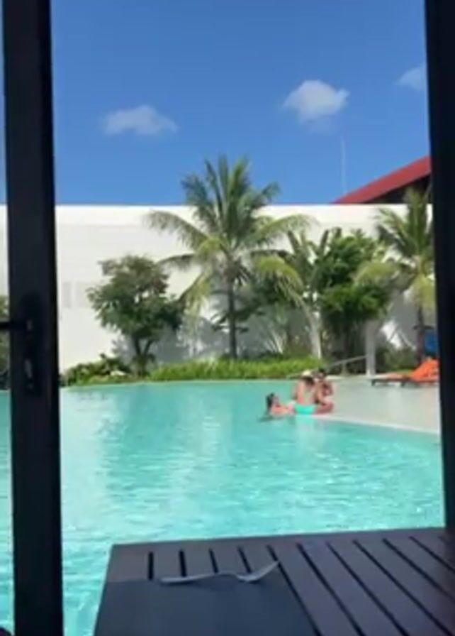 A person is seated at a wooden table in front of an open doorway or window, with cutlery and a black menu on the table. Beyond the doorway, there is a large, rectangular, turquoise-colored swimming pool. In the pool, two people are standing or sitting, one with a light-colored hat. Several lounge chairs sit at the edge of the pool, one holding an orange towel. Behind the pool is a white wall and tropical greenery, including palm trees. Above the greenery and pool, there is a bright blue sky with a few small clouds.