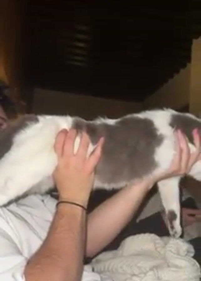 A person holds a grey and white cat on its back