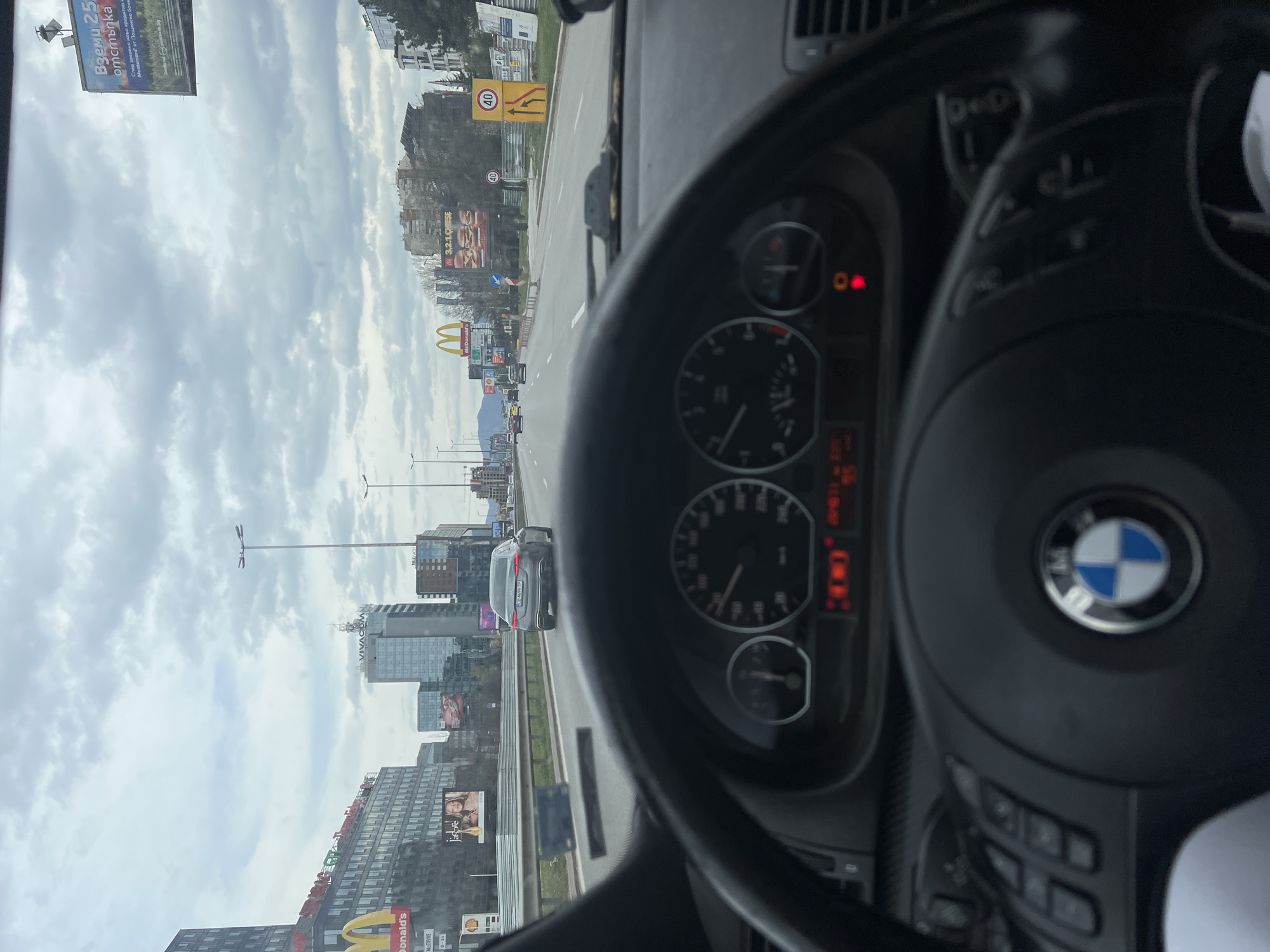 Here is a concise description of the image: The image shows a view from inside a BMW car, looking out through the windshield. The car is in Sofia, Bulgaria, driving along a street with buildings and billboards lining the sides. A McDonald's restaurant is visible on the left side of the street. There is a grey car traveling in the same direction in front. The dashboard and steering wheel of the BMW are in the foreground. A sign indicating a speed limit of 40 is also visible. The sky is overcast.