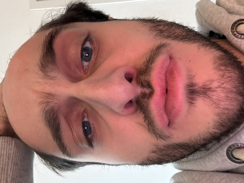 A close-up, front-facing portrait depicts a male individual in an indoor setting, identified as Strasbourg, France, though no specific visual markers of the city are present within the frame. The subject has dark brown hair, dark eyebrows, and blue irises. His face exhibits significant redness and swelling. Both upper and lower eyelids show prominent erythema and edema, with the area around the left eye (viewer's right) appearing particularly swollen. The lips are distinctly engorged and display a vibrant pink-red coloration. A dark brown beard and mustache are present, featuring a small goatee-style growth beneath the lower lip. The individual is wearing a light grey hooded sweatshirt, with a circular element, likely a drawstring eyelet or patch, bearing the partially legible text "SUPERDRY" visible on the lower left side of the frame. The background is uniformly bright and untextured, consistent with a plain wall or ceiling. No actions or interactions beyond the subject looking directly at the viewer are depicted.