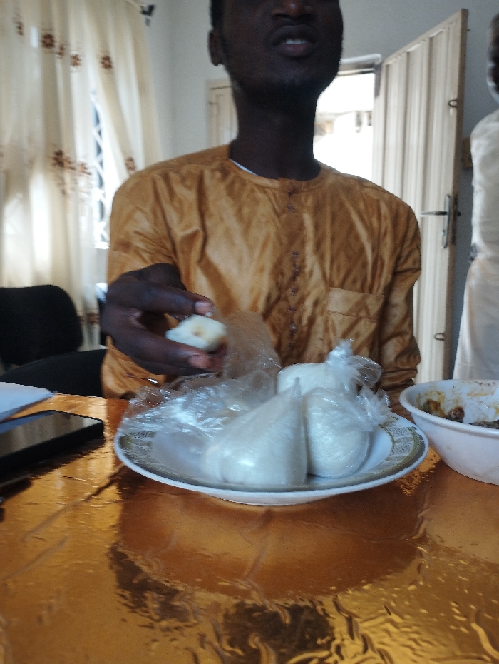 man sitting at a table in a room in Ashaka, Nigeria, located at latitude 10.917, longitude 11.476. He is wearing a long-sleeved, gold-colored shirt and is holding a piece of food, possibly a dumpling, in his right hand. There is a plate with three white, round food items on it in front of him, wrapped in plastic, and there is also a white bowl with unidentified food contents on the table. The man appears to be looking towards the right side of the image. The table is covered with a brown table cloth, and there is a white object and a black cell phone on the table. The background shows a white curtain on the left and a closed wooden door on the right. There is a partial view of a person in the distance, wearing a white garment. The scene depicts a casual, everyday meal at a home or a small restaurant.