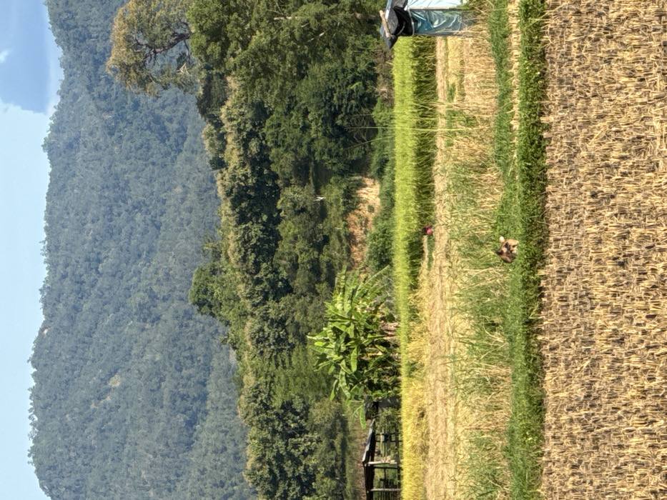 This image displays a rural landscape within the city of Ban Mae Ping, Thailand, under daylight conditions. The foreground consists of a harvested field, presenting a uniform expanse of short, light brown and tan stubble. Directly above this, a narrow horizontal band of green vegetation contains a small, light-brown animal, possibly a dog, partially visible and facing right. To the left of this animal, the field appears golden-yellow, indicative of recently reaped crops, while to its right, a section of vibrant emerald-green, unharvested vegetation is present. In the midground, positioned to the left, is an open-sided wooden structure with a dark, sloped roof, possibly a shed or shelter, adjacent to a dense cluster of green, broad-leafed plants, identifiable as banana trees. To the far right midground, a rudimentary, upright structure constructed from a blue tarp-like material, topped with a dark roof, is visible. A small, reddish-brown object is located within the green field section to the right of the banana trees. The background is dominated by a range of densely forested mountains, appearing dark green and extending across the horizon. The sky above is clear blue with scattered white clouds, one prominent cloud visible in the upper right. No human individuals are observed within the scene, and no direct actions or interactions are taking place.