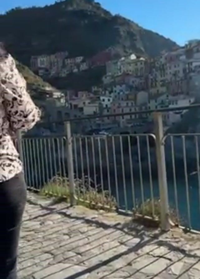 n outdoor scene with a view of a coastal town built on a steep hillside. The town is characterized by closely packed, colorful buildings. In the foreground, there is a stone-paved walkway with a metal railing overlooking the sea. Several people are present on the walkway. A woman with long, dark hair, wearing a patterned white and black blouse and black jeans, is standing near the railing. Another woman in a plaid coat is looking at her phone. A man in a red shirt and black jacket is walking in the background, carrying a white bag. Another person is using a phone on a tripod to film the scene. The day is sunny, and the sky is clear. The water is deep blue.