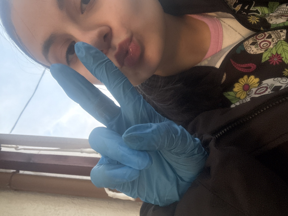 The image depicts a close-up, angled view of a person, identified as female, partially visible in an outdoor setting in Radomir, Bulgaria. The subject's right eye, right cheek, and mouth are visible, with her lips pursed in a "kiss face" expression. Her left hand, prominently featured in the foreground, is covered by a light blue disposable glove and is positioned in a "peace sign" gesture, with the index and middle fingers extended upwards. The subject wears a dark-colored, zippered jacket adorned with a colorful pattern that includes calavera (sugar skull) designs, yellow sunflowers, green leaves, and pink floral or paisley motifs. Beneath the jacket, a white undershirt and a pink crew-neck garment are visible, along with a thin, silver-colored chain necklace. The background consists of a light-colored building surface or wall with a vertical dark brown wooden beam. A thin white pipe runs vertically near the wall. Above this, an overcast or light blue sky with faint cloud patterns is visible, bisected by a thin, dark horizontal utility line.