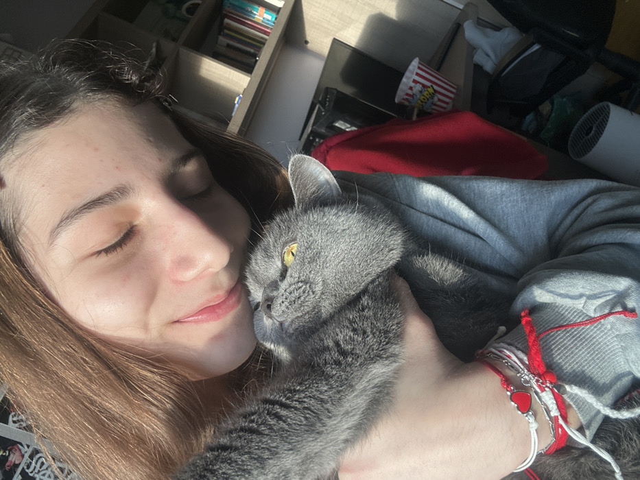 A young female subject is depicted in an indoor setting, identified as the city of Ruse, Bulgaria. She is seen holding a short-haired grey cat with yellow eyes, pressing her face against its head. The female has long brown hair, and her eyes are closed, with a slight smile evident. Her left wrist displays multiple red and white string bracelets, one featuring a red heart charm. She is wearing a grey hooded garment. The cat's head is tilted upwards towards the female's face. The background, illuminated by strong natural light from the right, reveals a wooden bookshelf filled with books. Below the bookshelf, a dark surface functions as a desk, holding a red and white striped popcorn bucket, a dark electronic device, and red fabric. A white cylindrical object is partially visible in the lower right corner. The overall scene conveys a close, affectionate interaction between the female and the cat within a residential environment.