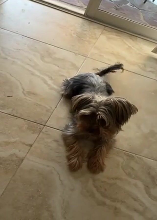 A small dog, likely a Yorkshire Terrier, is lying on a light-colored, patterned tile floor near a sliding glass door
