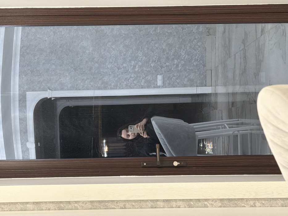 A person holds a phone, presumably taking a selfie, reflected in a closed window