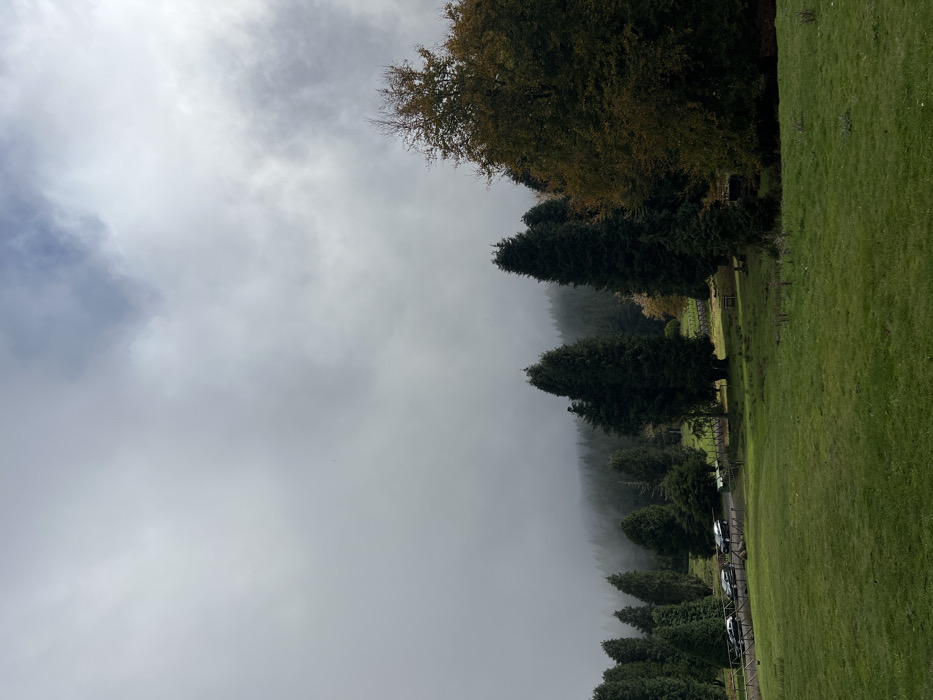 The image depicts a rural landscape within the city of Machico, Portugal, under an overcast and misty sky. The foreground comprises a vast, well-maintained green grassy field. In the midground, a dark, unpaved road or track curves from left to right, bordered by a low, rustic wooden fence. Five dark-colored passenger vehicles, possibly SUVs, are parked parallel to the road. Beyond the road, a dense collection of tall, dark green evergreen trees, primarily conifers, stands prominently, with one large deciduous tree displaying yellowish-brown autumn foliage on the right. The background is dominated by a thick layer of fog or mist, obscuring a dense forest that extends into the distance. The sky is heavily clouded, featuring shades of light to dark gray. No individuals are present in the scene.