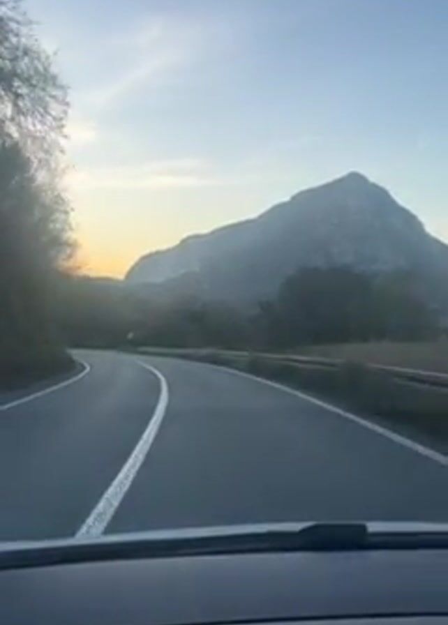 view from inside a car driving on a winding road. The road has a solid white line separating the lanes. On the left, there are trees and vegetation along the roadside. On the right, a metal guardrail runs alongside the road. In the distance, a large mountain dominates the horizon, partially obscured by haze. The sky is blue with a few wispy clouds, and the sun appears to be rising or setting. A yellow warning sign is visible on the right side of the road.