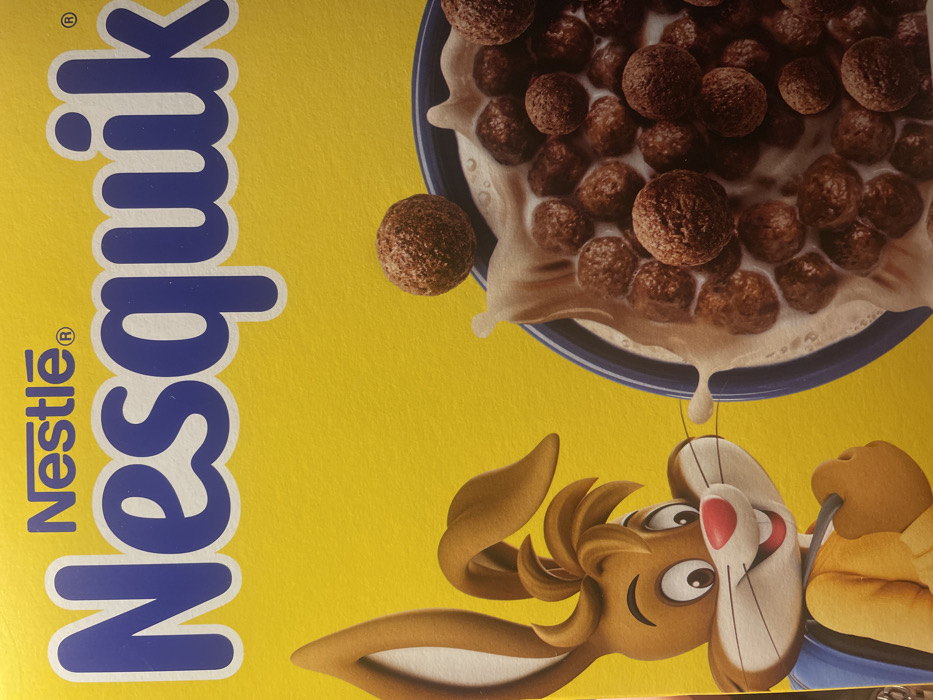 A bright yellow Nesquik cereal box features the brand name "Nesquik" in large, blue letters