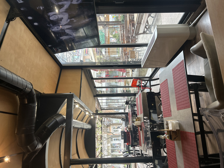 The scene depicts the interior of a largely unoccupied restaurant or cafe, situated in Sliven, Bulgaria. The establishment features a modern design with extensive glass-paneled walls and a ceiling integrating light-colored panels and exposed dark-colored cylindrical ventilation ducts. In the foreground and midground, multiple tables are visible, each set with dark grey tabletops and rectangular red woven placemats. Each table includes a wooden condiment caddy containing small bottles (likely oil and vinegar) and a napkin dispenser. Seating consists of various chair styles, including dark-framed chairs, transparent plastic chairs, and light upholstered armchairs. A single red-framed chair stands out near one of the glass walls. Against the glass wall, a white, low-profile heater unit is positioned. Above, a large, black flat-screen television is mounted, displaying a black and white image of two female figures, appearing to be performers on a stage. Through the glass walls, an outdoor area is visible, featuring numerous unoccupied wooden tables and benches, some with umbrellas. Beyond this immediate outdoor seating, a street lined with trees, some bearing light blossoms, is observed. Buildings with distant signage are present, and one individual is walking on the street in the distance. The overall impression is that of an enclosed dining space with a direct view of a city street and an outdoor patio.