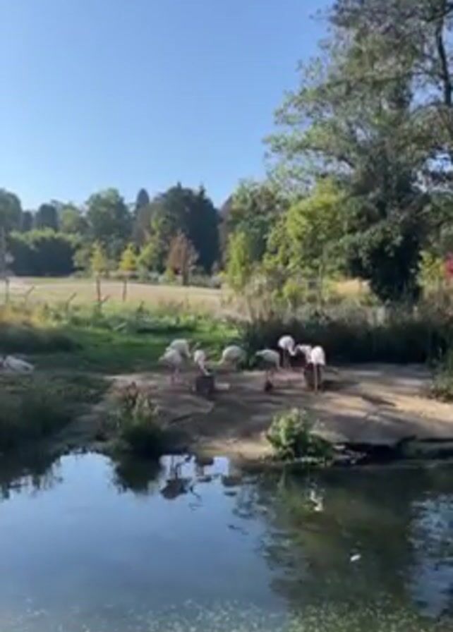 small group of flamingos standing by a pond on a bright, sunny day. The flamingos are of varying shades of pink and white, with some having longer necks and legs. They are near the edge of the pond on a small patch of dirt. A larger expanse of grass and trees is in the background under a clear blue sky. Some of the flamingos are pecking at the ground while others are standing tall. At least one is flapping its wings. There is a fence visible in the distance.