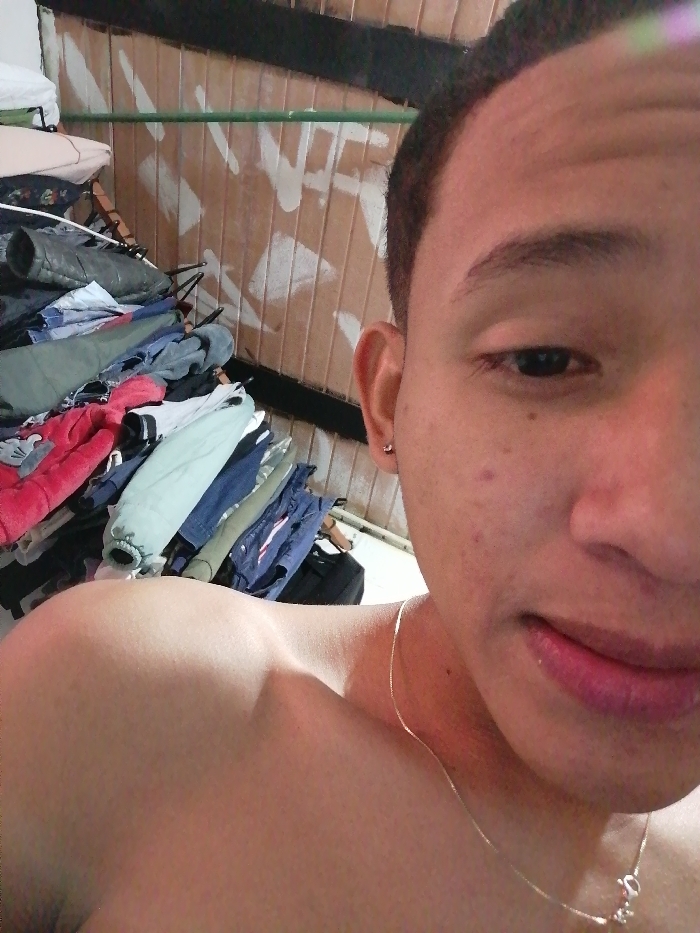 The image presents a close-up, partial view of a male individual in an indoor setting. The subject's upper right facial area, encompassing the right eye, nose, and mouth, along with his bare left shoulder and upper chest, are depicted. He has short, dark hair, a small silver stud earring in his right earlobe, and a thin, gold-colored chain necklace with a clasp visible around his neck. Minor skin blemishes are observed. To the subject's left, a substantial, unorganized pile of clothing, including jackets and shirts in assorted colors such as dark green, red, light blue, and denim, is stacked. Behind these garments, a light brown, vertically paneled wall exhibits white spray-painted markings. A dark horizontal beam is visible at the top left, with a green horizontal bar beneath it. A light-toned floor is partially visible at the lower right. The subject's gaze is directed towards the camera. This indoor scene is located within the city of Soacha, Colombia.
