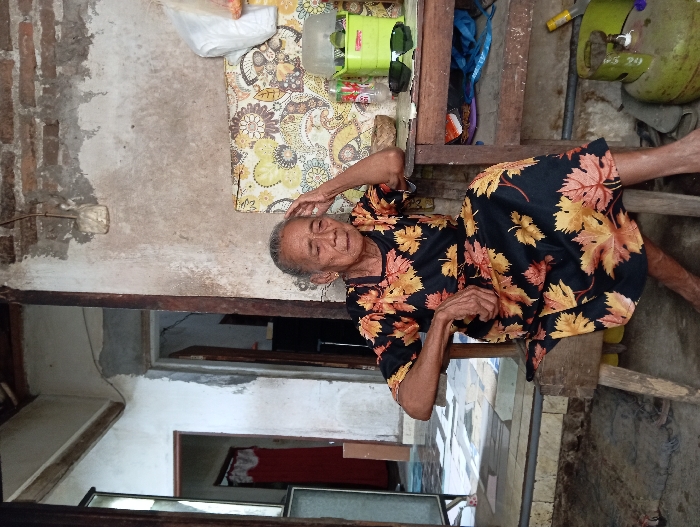An elderly woman in a black dress patterned with orange and yellow leaves reclines on a wooden structure. Her left hand rests on her head, and her gaze is directed towards the camera. Behind her, a wall shows signs of wear and tear. A patterned surface sits above her, and a green gas cylinder is visible to her right. A doorway provides a glimpse into an interior space.
