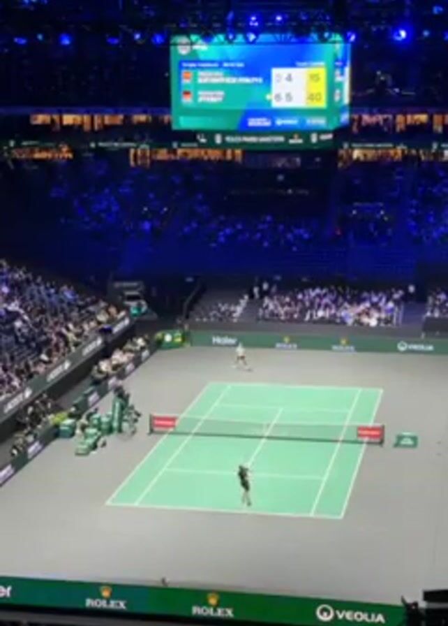 n overview of a tennis match in a large indoor stadium. A tennis player serves a ball, hitting it over the net to his opponent. The scoreboard shows the current score of the match with player names and scores. The stadium is filled with spectators watching the game. Brand logos of sponsors like Rolex, Haier, and Veolia are visible around the court and in the arena.